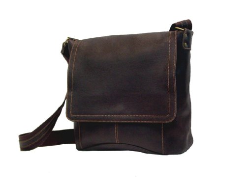 Material: distressed leather Size: 13" x 13" x 5.5" Features: Flap-over messenger closes with magnetic snap Front open pocket under flap Large open pocket Pen loops Card pockets Adjustable web strap with leather applique Colors: Brown