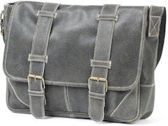 Gorgeous vintage leather computer messenger bag is hot, hot, hot. Features a rustic double-buckle stitch designed front. The buckle has a quick release. Inside front has two deep leather pockets. Center section contains a removable padded laptop case which holds most 17 inch laptops. The Front interior has a section for pens, pencils, phone, ipod, business cards and more! This messenger bag comes with an adjustable leather and nylon strap. Measures: 13"x17"x4" SLATE GRAY IS OUT OF STOCK UNTIL 2/23.