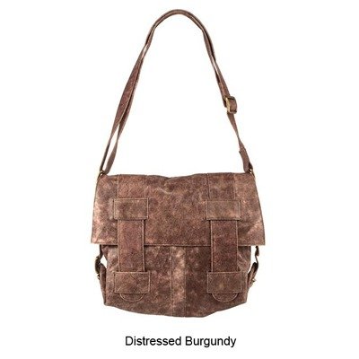 7644DBU Color: Distressed Burgundy Pictured in Distressed Burgundy Features: -Half flap secured by two leather straps and hidden magnetic snap closures - side belt and buckle detailing.-Adjustable 1.25'' shoulder strap with a minimum drop of 12'' and a maximum drop of 24''.-Two open pockets under leather flap - interior of bag secured by a magnetic snap.-Interior back wall zippered pocket.-Interior organizer with cell phone pocket, four credit card slots and two pen / pencil holders.-Cloth dust bag for storage when bag is not being used. Construction: -Constructed of 100pct leather. Color/Finish: -Colorful fabric lined interior. Dimensions: -Dimensions: 11.5'' H x 11.5'' W x 4'' D. Warranty: -One year limited warranty.