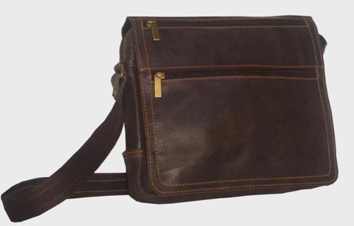 Material: Distressed Leather Size: 12" x 9.5" x 2.5" 2 zip pockets on front flap Zip pocket under front section under flap Main compartment has padded laptop section with main organizer Flap closed with magnetic snap Adjustable web shoulder strap with leather applique