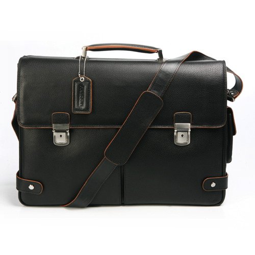 Orange edges give this classic messenger-style brief bag a tint of modern look and city style. It has two stash pockets under the flap, a flap pocket at the side, and a rear zip pocket. Two interior zip pockets separate the three compartment. It also features two card pockets, three pen loops, a cell phone/iPhone pocket, a flap pocket, a key fob, and a multifunction zip pocket. The 40" removable, adjustable padded shoulder strap allows you to wear it over the shoulder or across the body. Fabric lining. Approx. 4.4 lbs.